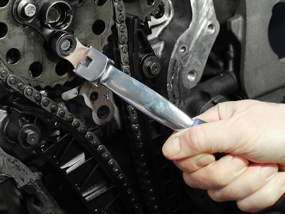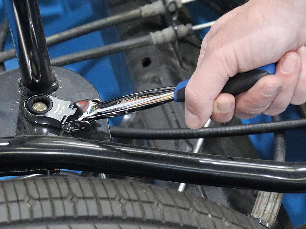 An innovative flexible headed spanner handle with 12 interchangeable ratchet ring spanner heads from sizes 8mm up to 19mm. Manufactured from chrome vanadium, fitted with a soft grip handle for ease of use, with the ratchet heads each featuring a 72 teeth mechanism for fast engagement and ideal for use in confined spaces.