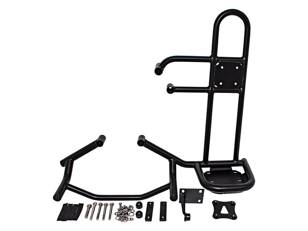 Designed to work with the existing spare wheel carrier as a cradle to rest the wheel on whilst attaching with bolts. Uses existing mounts in the rear door with no modifications required.