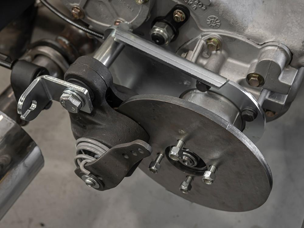The disc transmission brake uses a state of the art monster sized mechanical caliper designed for agricultural vehicles and earth moving equipment - so using it on a Land Rover is easy work for it. The mechanism is sealed so it will not seize up due to ingress of mud or water and it uses special 'sintered' pads which are resistant to abrasion from mud as well as providing greater friction against the disc than a standard pad. The disc has been specially designed for Land Rovers and manufactured from tough 10mm thick steel. It has a smaller diameter than a standard drum and so does not dangle below the transfer box which helps it to protect it from whatever you are driving over. The caliper mechanism sits in a well protected area at the top, away from most of the mud and water.